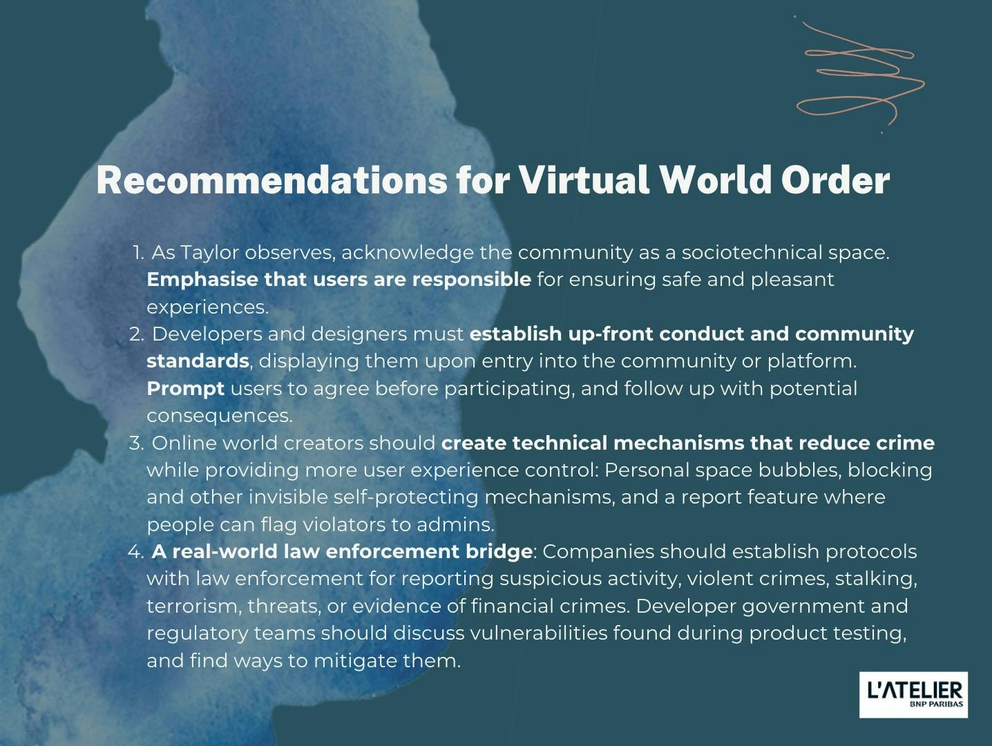 Jacques says that while users naturally need to create order, tech regulations will provide a more macro direction. “If the future of the metaverse is siloed in centralisation, then it will be like social media, then platforms will say, ‘Hey, we can't control this content.’ If it is decentralised, it would be much clearer that we would need a third party.”