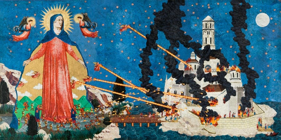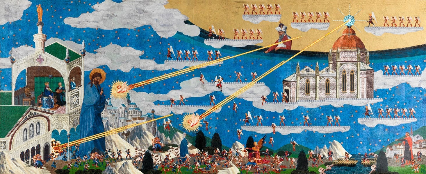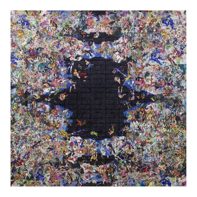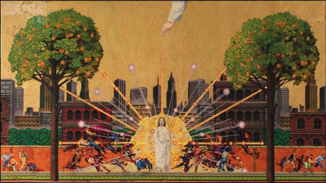 All artwork comes from the various exhibits of Dan Hernandez, associate professor of the University of Toledo's art department. His paintings explore the visual dialogue between religion, mythology, and pop culture, including digital offerings like gaming. He is represented by Kim Foster Gallery in New York City, and Galeria Meraki in Ponte de Sor, Portugal.