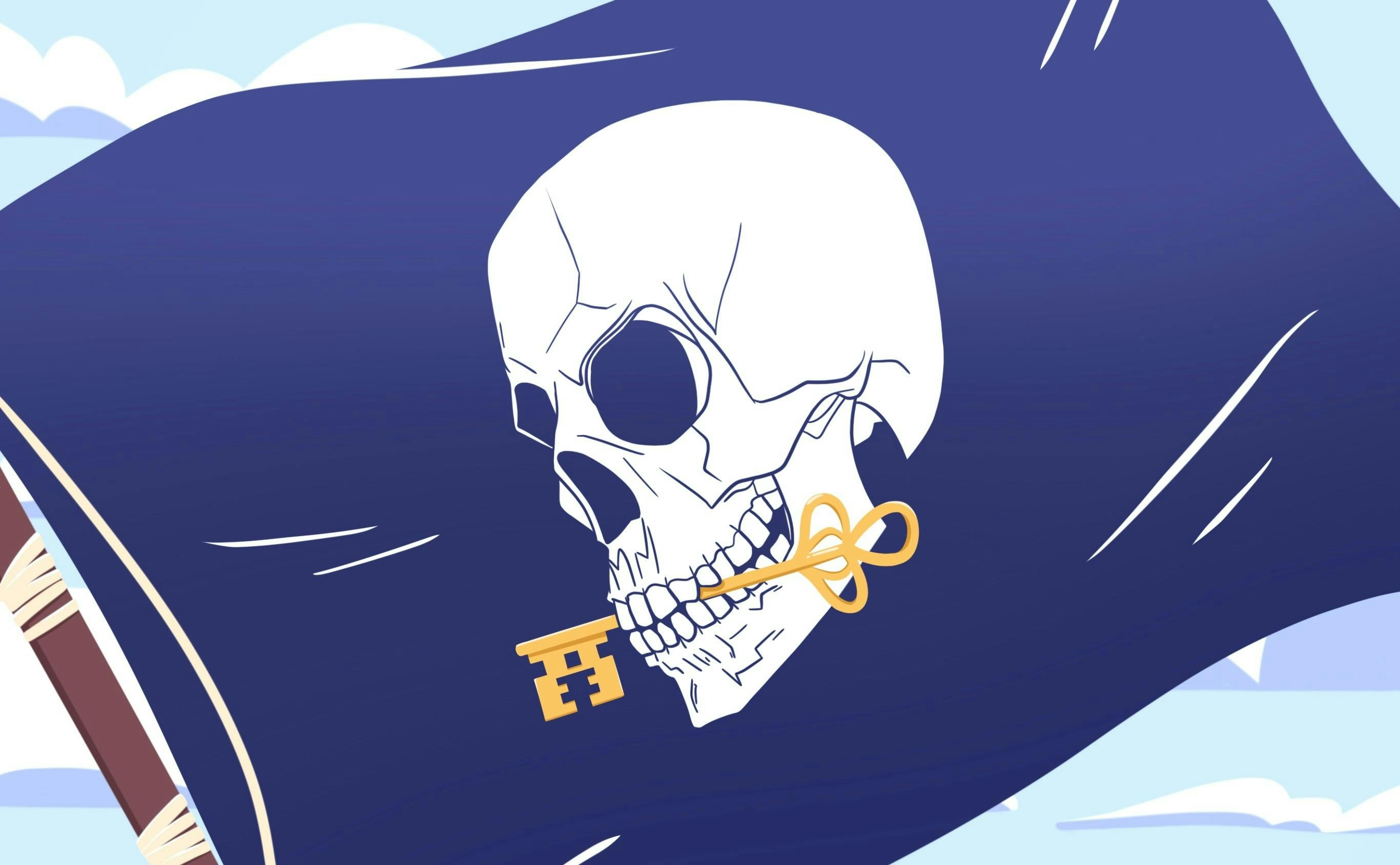 On a pirate flag, a skull's teeth tightly grip a golden key.